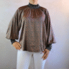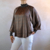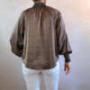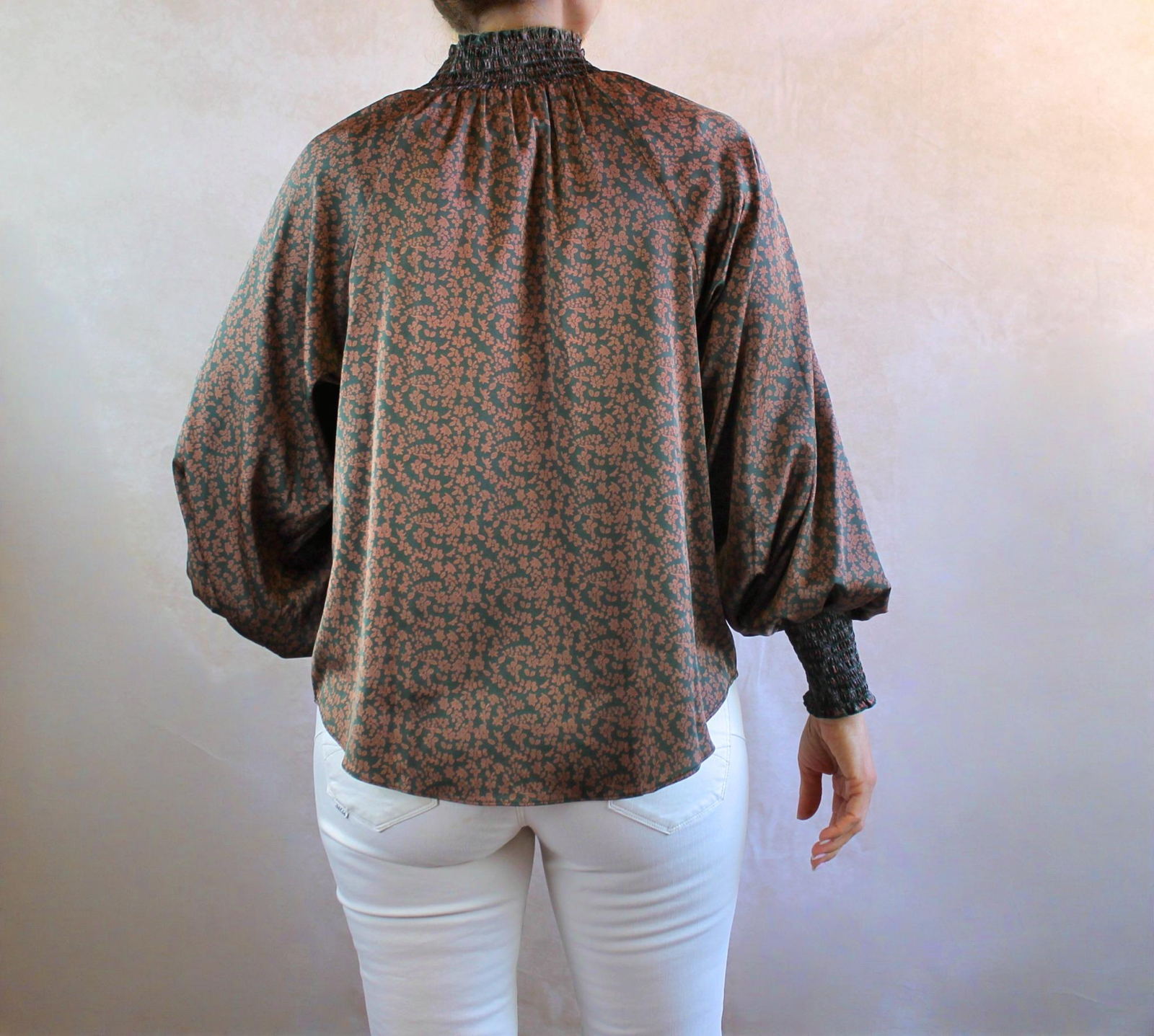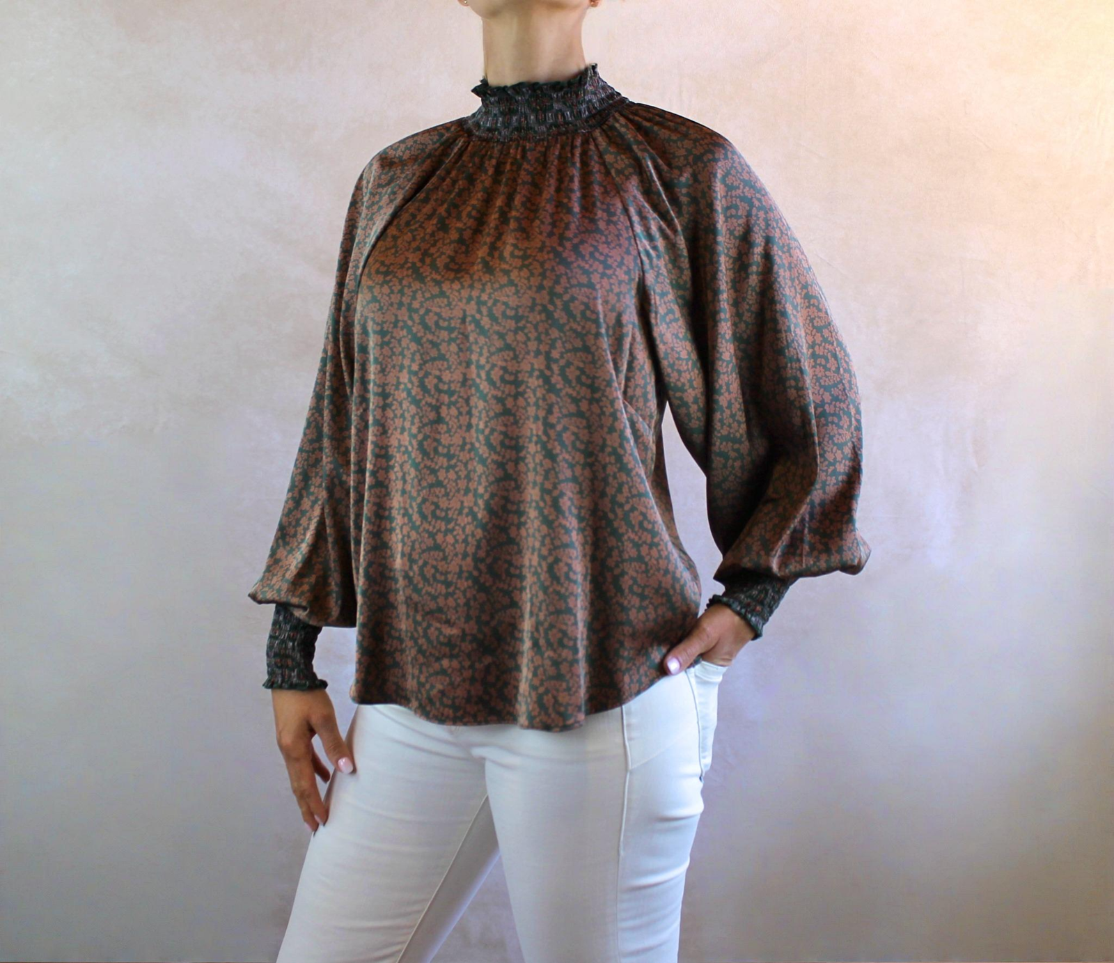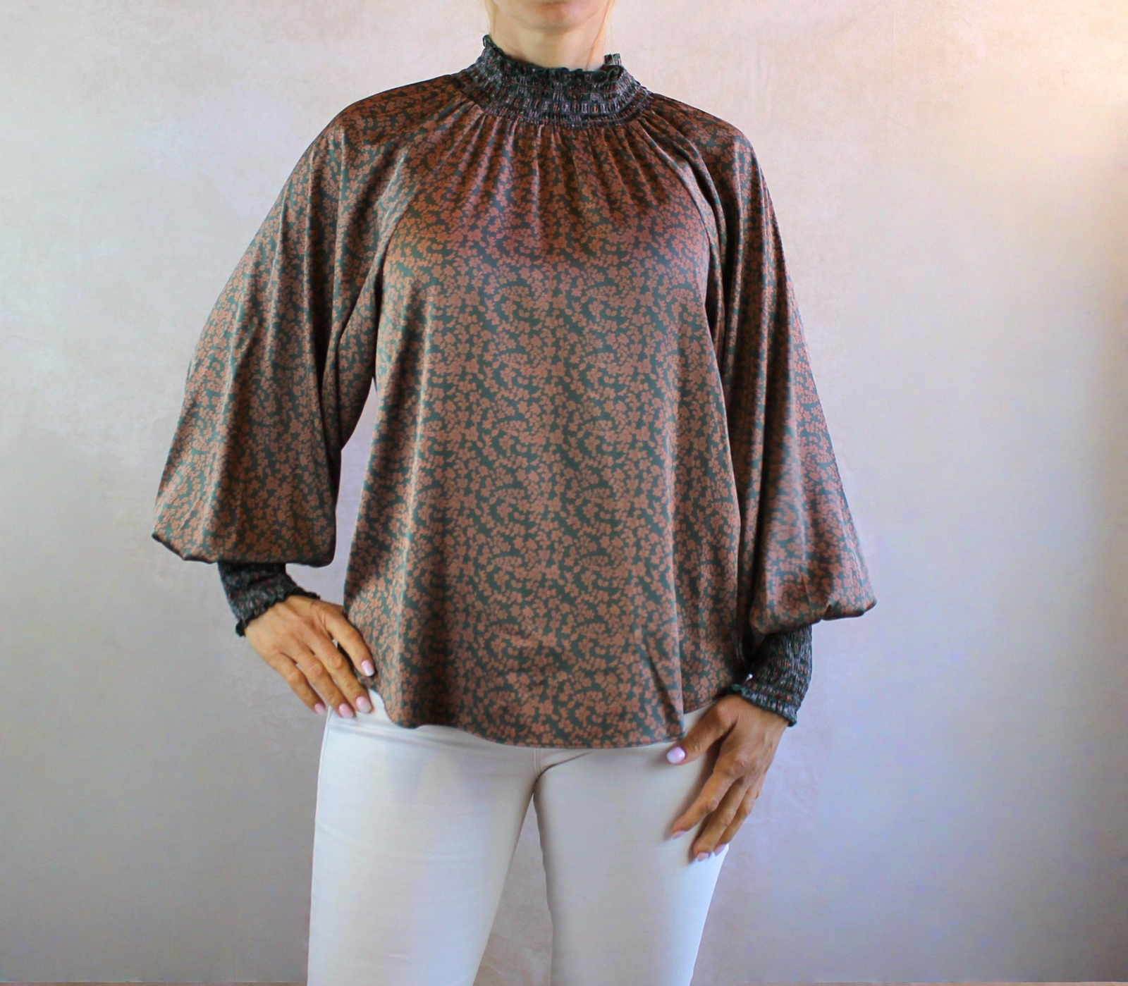Blusa de manga abullonada con cuello fruncido, confeccionada en tejido ligero con estampado en tonos marrón y verde oscuro. Su silueta holgada y puños elásticos aportan comodidad y un estilo elegante, perfecta para looks casuales o más arreglados.
