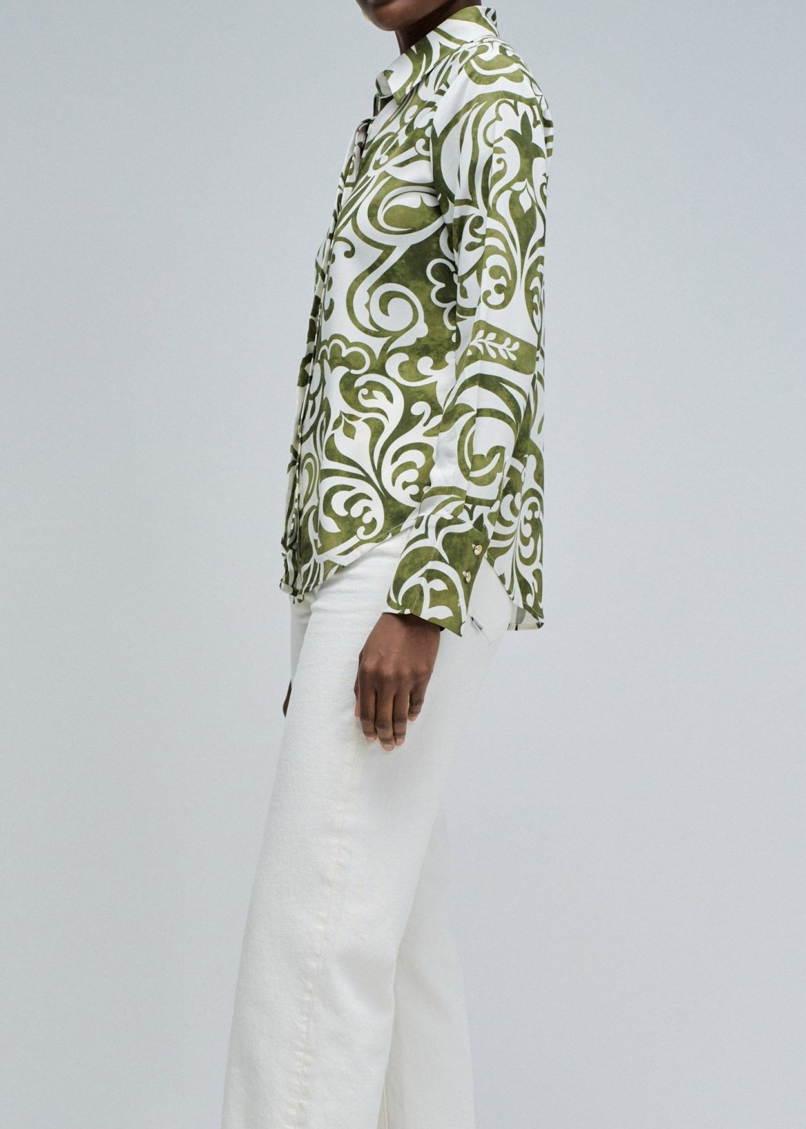 Una camisa que evoca frescura y personalidad. El blanco luminoso sirve de lienzo para un estampado verde lleno de movimiento, que transmite energía y sofisticación a partes iguales. Perfecta para destacar en un look casual con vaqueros o para aportar carácter a un conjunto más elegante. Una prenda versátil que convierte lo cotidiano en especial.