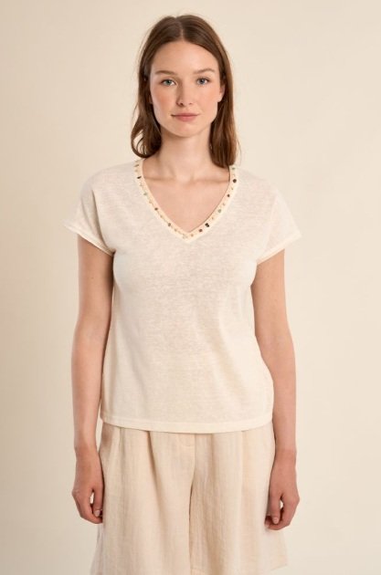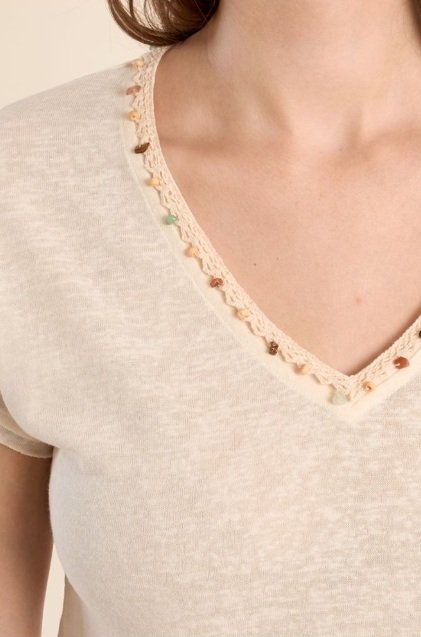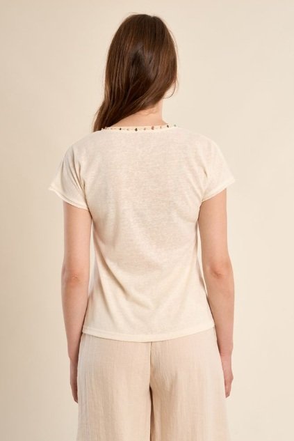 Una camiseta básica con un toque especial. En tono crudo, su diseño se eleva gracias al detalle decorativo en el escote en pico, que aporta un acabado delicado y diferente.