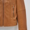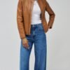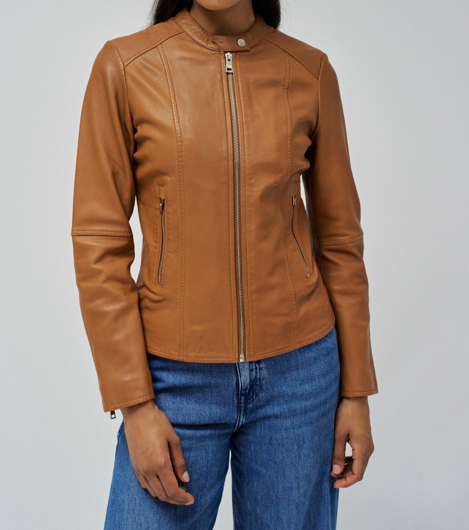 Añade un toque sofisticado a tus looks con esta chaqueta de cuero camel. Su diseño entallado con costuras marcadas estiliza la silueta, mientras que el cuello recto con broche y el cierre metálico central aportan modernidad y elegancia. Perfecta para combinar con jeans o vestidos, es una prenda versátil y atemporal que no puede faltar en tu armario.