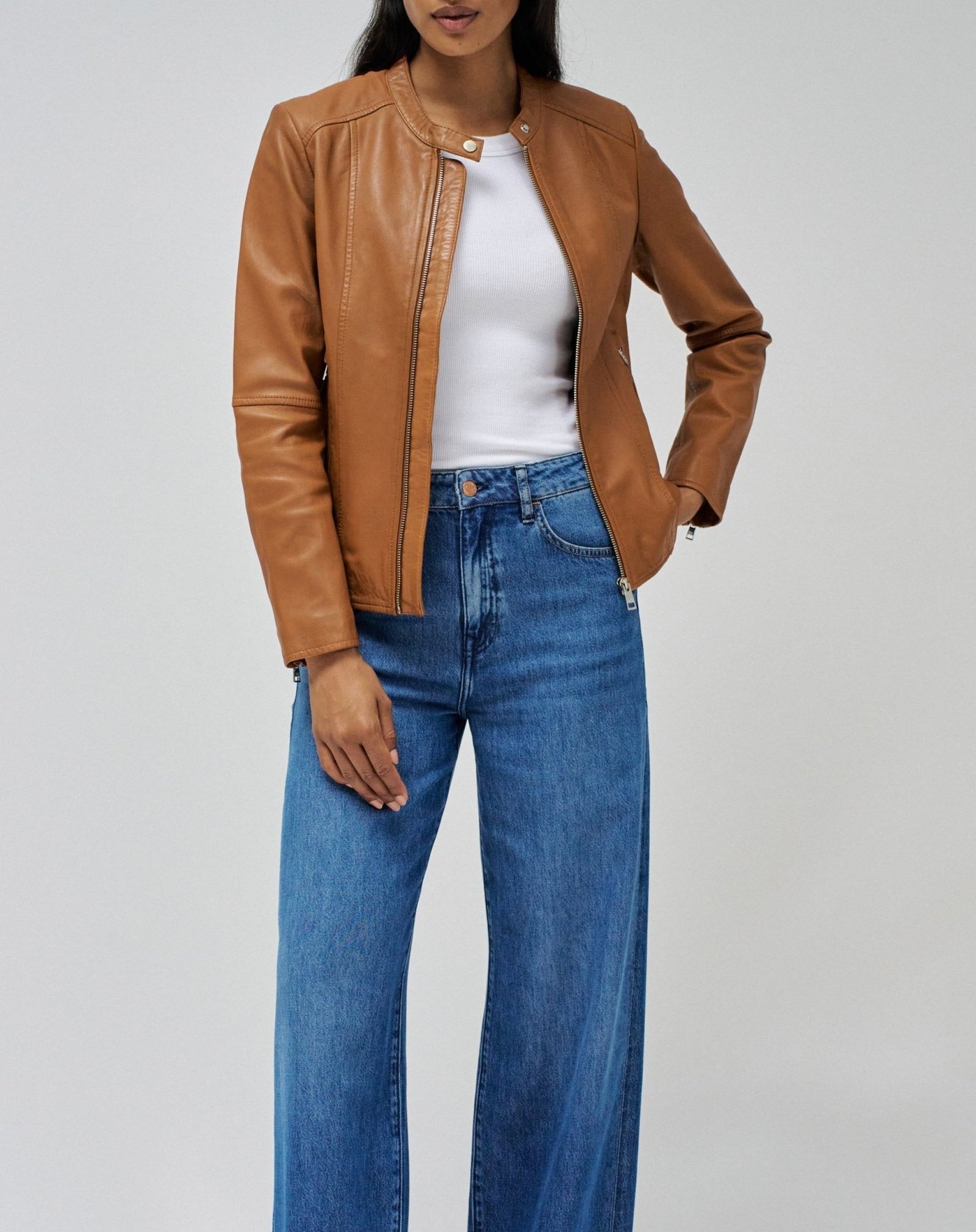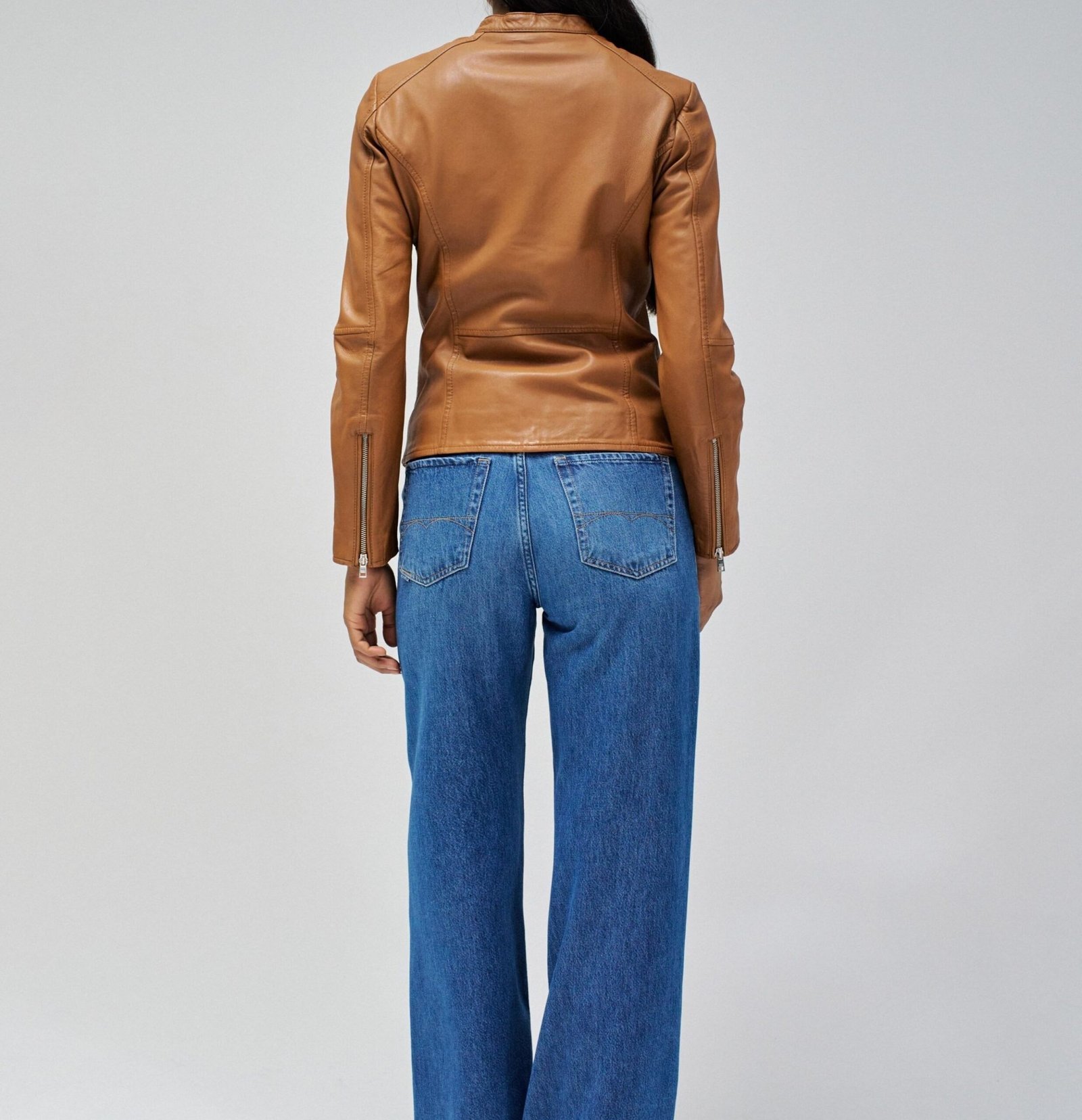 Añade un toque sofisticado a tus looks con esta chaqueta de cuero camel. Su diseño entallado con costuras marcadas estiliza la silueta, mientras que el cuello recto con broche y el cierre metálico central aportan modernidad y elegancia. Perfecta para combinar con jeans o vestidos, es una prenda versátil y atemporal que no puede faltar en tu armario.