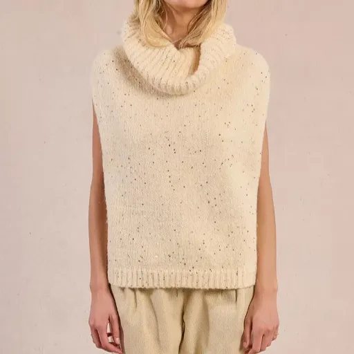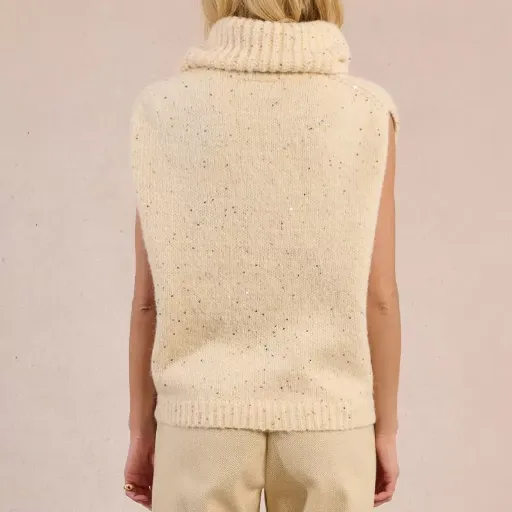 Jersey de color blanco con pequeñas lentejuelas multicolor que aportan un sutil toque de brillo. Su cuello amplio y caído le da un aire acogedor y elegante, ideal para quienes buscan comodidad con un guiño sofisticado.