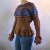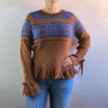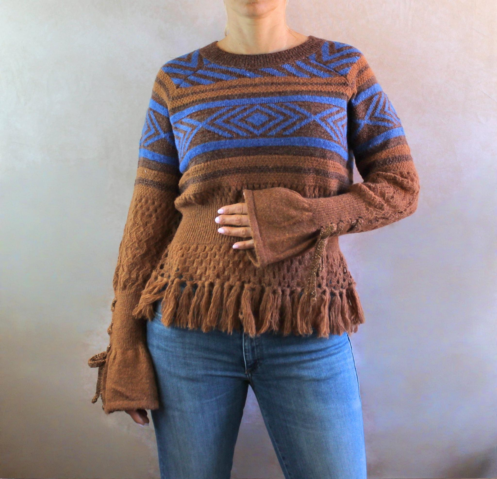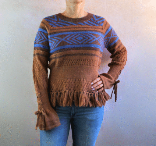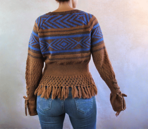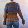 Jersey de punto con diseño geométrico, en tonos marrones y azul intenso. Presenta una combinación de texturas artesanales, detalles calados y un original acabado con flecos en el bajo. Las mangas incluyen lazadas decorativas que aportan personalidad y un estilo bohemio. Una prenda cálida y única, ideal para looks casuales con un toque distintivo.