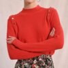 Jersey de manga larga en punto fino, con cuello redondo ligeramente subido y detalles de botones metálicos en los hombros que aportan un aire moderno y elegante. Su corte recto lo convierte en una pieza versátil que realza cualquier look con un toque de color vibrante.
