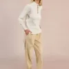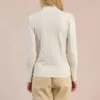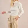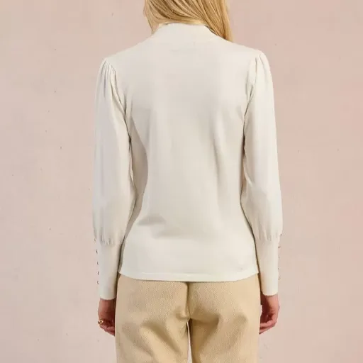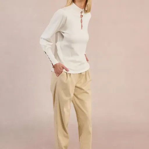 Un jersey de manga larga confeccionado en punto suave, con cuello alto y un elegante detalle de aberturas frontales unidas por aros metálicos. Sus puños con botones aportan un acabado sofisticado y femenino. El corte ligeramente entallado estiliza la silueta sin perder comodidad.
