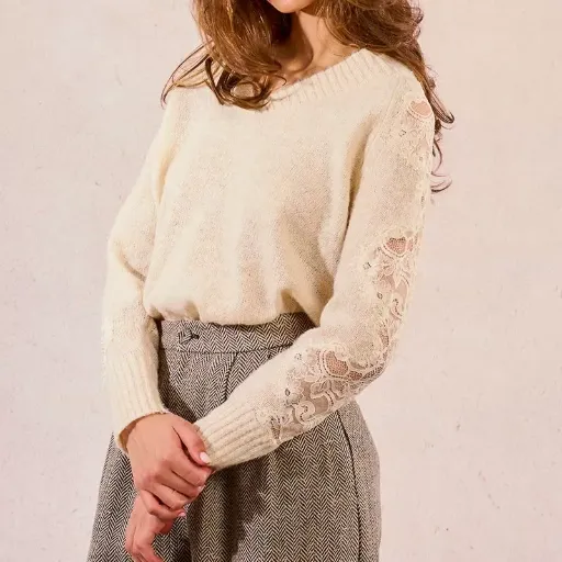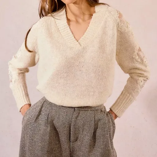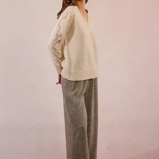 | Jersey de manga larga en punto suave con escote en V y detalles de encaje en las mangas que aportan un aire romántico y delicado. Su textura cálida y su corte relajado lo convierten en una prenda cómoda y femenina, ideal para los días más frescos. |