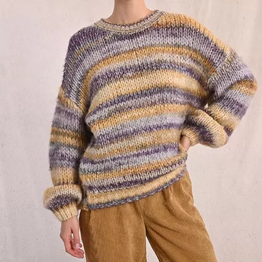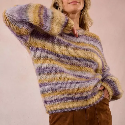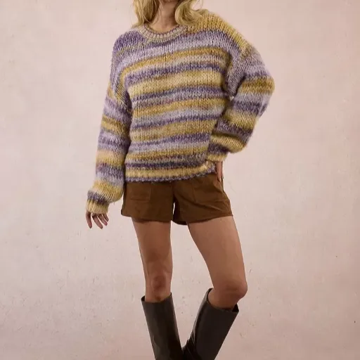 Jersey de manga larga con corte oversize, confeccionado en punto grueso y cálido con franjas en tonos mostaza, lila y crema. Su estilo relajado y acogedor lo convierte en una pieza ideal para looks informales de temporada, aportando color y comodidad a partes iguales.