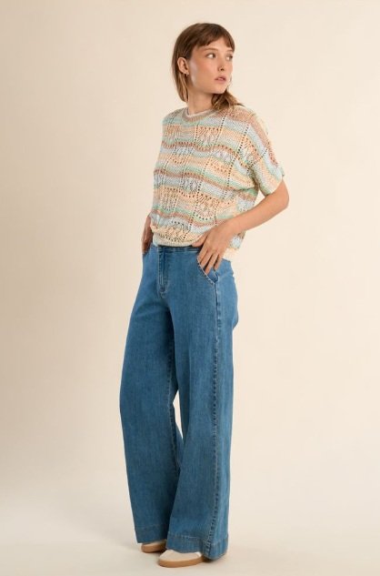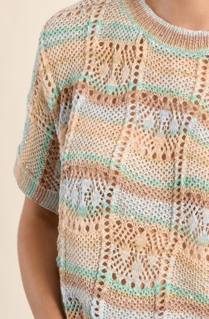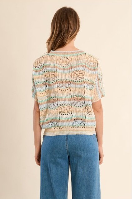 Un jersey ligero y lleno de frescura, con un diseño calado que aporta textura y un sutil juego visual. Sus rayas en tonos suaves crean una combinación armoniosa, perfecta para looks relajados.