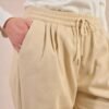 Pantalón de corte recto en color beige, con cintura elástica ajustable mediante cordón y delicado tejido con diseño de espiga. Su estilo combina comodidad y elegancia, ideal para quienes buscan un look relajado pero con un acabado sofisticado. Incluye detalle de bolsillo trasero con cierre de botón.