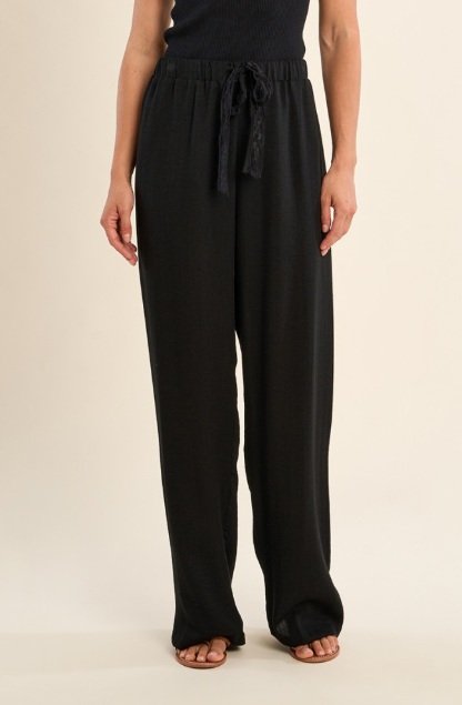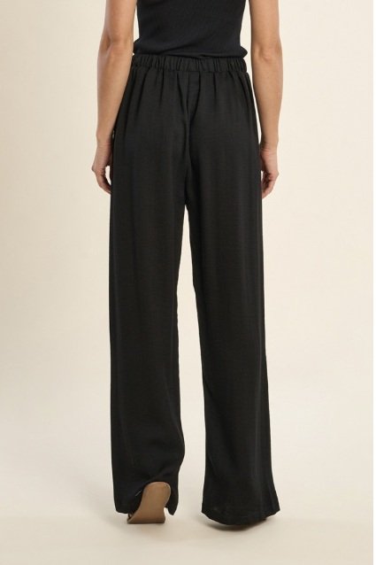 Pantalón fluido disponible en color negro y crudo con cintura ajustable.