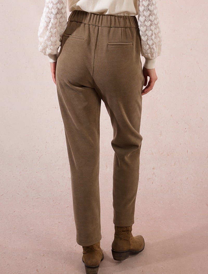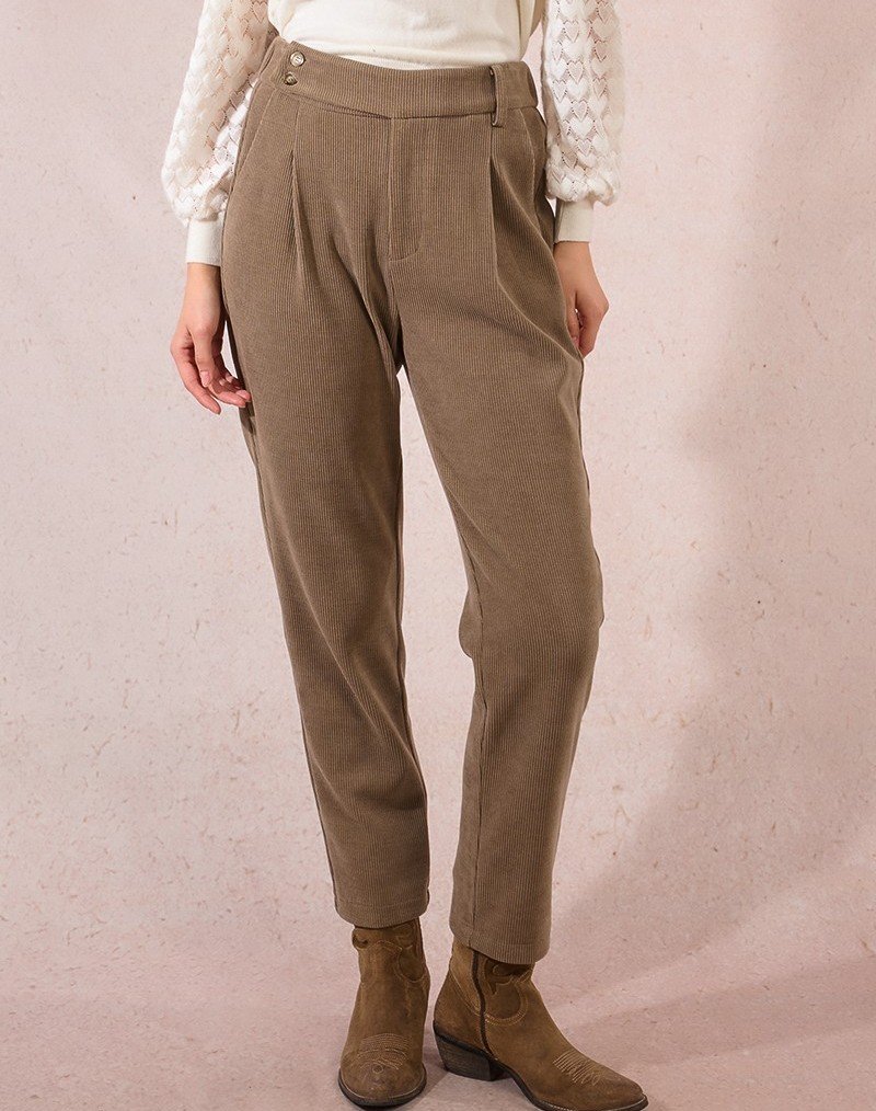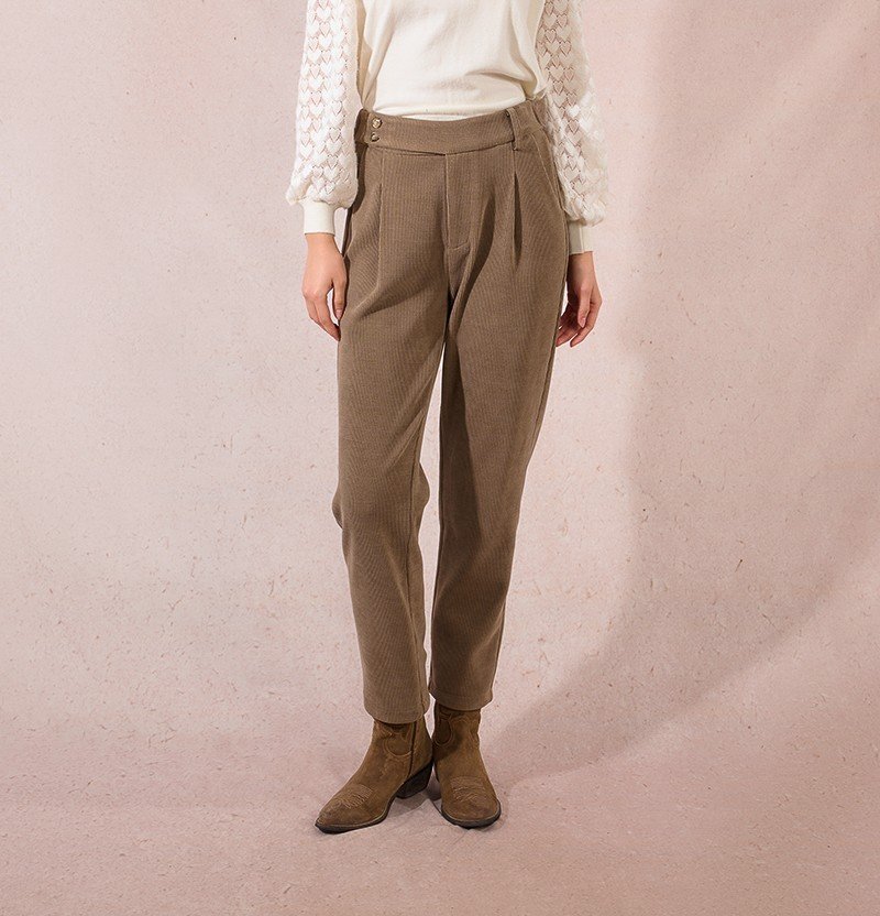 Pantalón en tejido de micropana de tacto suave, con corte tobillero y pinzas delanteras que estilizan la silueta. Su diseño incluye cierre con botones laterales en la cintura, aportando un detalle sofisticado y diferente. Una prenda cómoda y versátil, perfecta para el día a día.